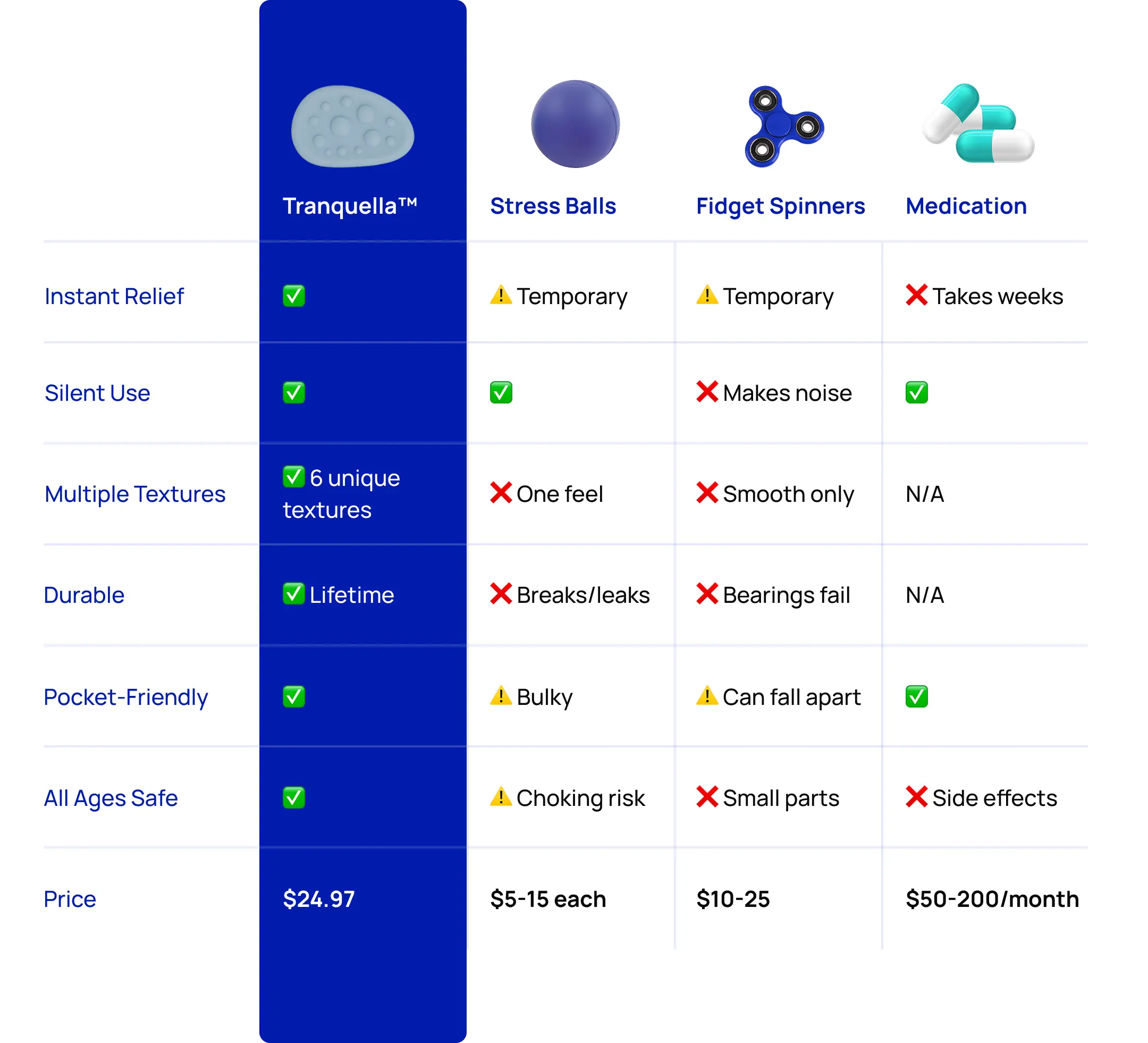 Unlike basic stress balls that wear out or loud fidget spinners that distract others, Tranquella™ stones provide lasting, discreet relief that grows with your needs.